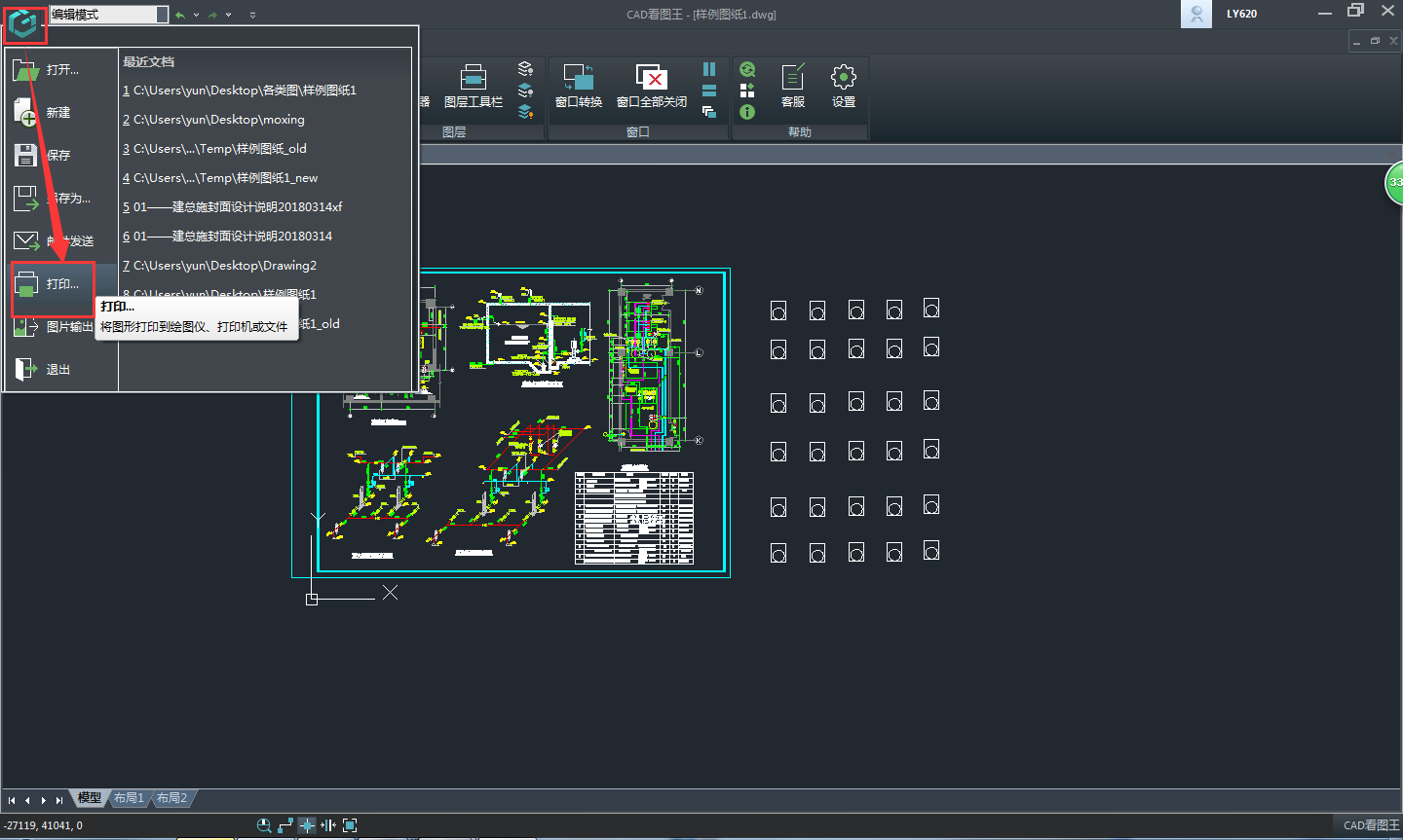 软件有览图模式和编辑模式,览图模式,做到了快速打开图纸即可浏览,方便又快捷;软件的编辑模式下,是为了方便大家进行一些简单的编辑操作,与常用的编辑工具和扩展工具;常用工具包括绘制移动、缩放、图层管理等,扩展工具包括直线、多线等的绘制、文字编辑、图纸比较等。当我们拿到一张图纸,为了看图方便或者其他方面的需要,我们会将图纸打印出来,浩辰CAD看图王电脑版为了满足大家的使用,在软件中加入了打印的功能,但是,我们在使用此功能的时候会有个困扰,如何选择打印的内容?如果不能按照图框选择打印内容,打印出来的图纸可能会出现看不清的功能,那么,当遇到这种情况该怎么办呢?