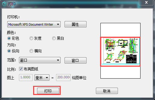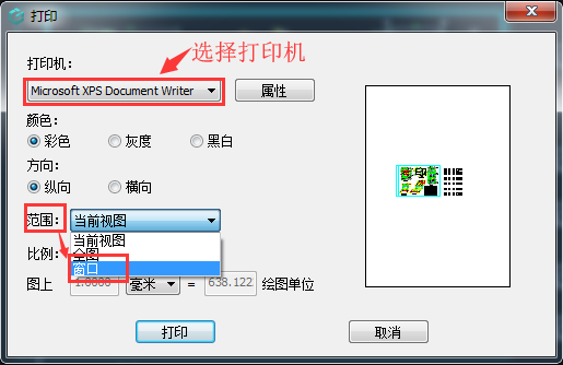 3、在打印对话中设置打印的相关内容,选择打印机,打印范围的框选,选择窗口;